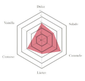 Chocolate con intensas notas de caramelo y un atractivo color dorado, acompañado de matices lácteos y cremosos combinados con un sutil toque salado, que ofrecen una experiencia sensorial única.