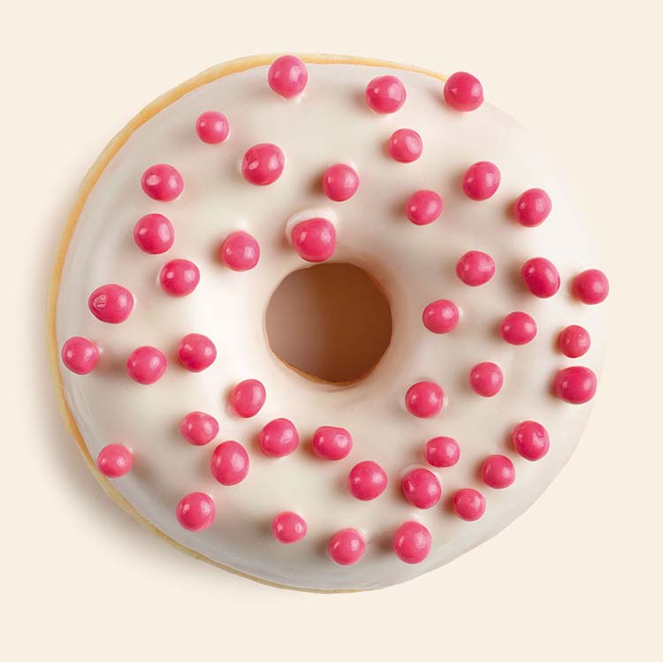 Núcleo de cereal de 5 mm de diámetro recubierto de chocolate fresa.