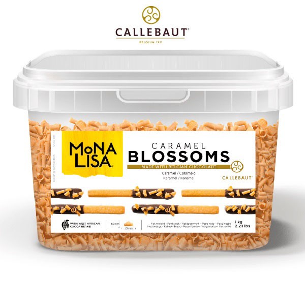 Los Rizos de chocolate caramelo también llamados Blossoms de caramelo, son diminutos trozos de chocolate con un sabor y aroma a caramelo. Su sabor combina el cuerpo de cacao redondo del chocolate con leche con el agradable dulzor del caramelo de mantequilla.