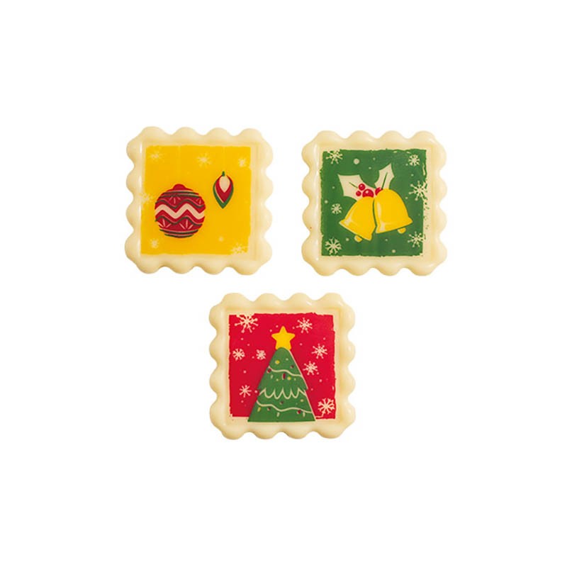 Surtido de Sellos Navideños compuesto por tres sellos de chocolate blanco, todo ello de chocolate blanco para decorar platos o para acompañar a un café, té, o postre. Especial para postres para Navidad.